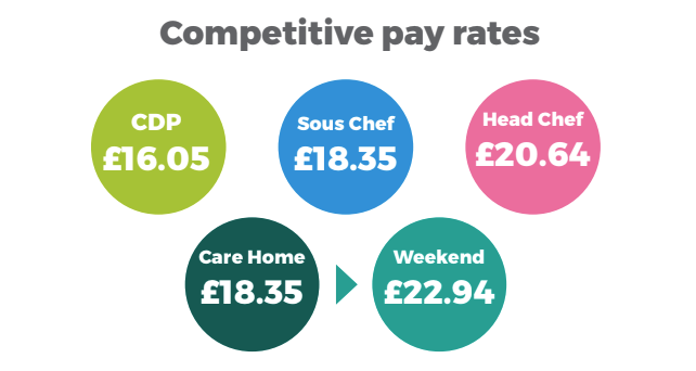 Our rates are dependent on your experience but a CDP can expect to earn £14 p.h, a sous chef, £16 p.h, a Head chef, £18 p.h and an Executive chef or weekend care home chef, £20 p.h.